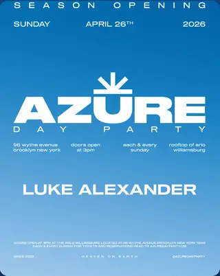 Azure Day Party Season Opener with Luke Alexander on April 26, 2026 at Arlo Williamsburg, New York City features Luke Alexander performing electro DJ sets.