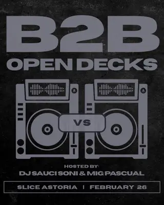 B2B Open Decks takes place at Slice Astoria in New York, United States on February 26, 2026. Featuring Kristen London, DJ Sauci Soni. House and Hardcore sounds all night.