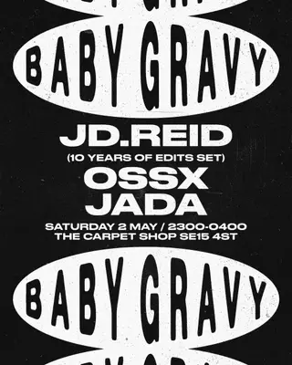 BABY GRAVY: JD. REID, OSSX & JADA on May 2, 2026 at The Carpet Shop, London features JD. REID, OSSX and JADA performing DJ sets.