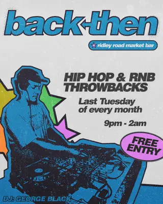 Back Then takes place at Ridley Road Market Bar in London, United Kingdom on May 26, 2026. Hip-Hop and R&B sounds all night.