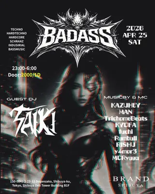 BADASS takes place at BRAND SHIBUYA in Tokyo, Japan on April 25, 2026. Techno and Hardcore sounds all night.