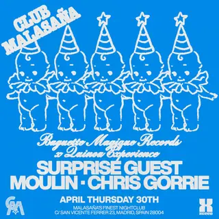 Baguette Magique Records x Quinoa Experience on April 30, 2026 at Club Malasaña, Madrid features Moulin and Chris Gorrie performing house DJ sets.