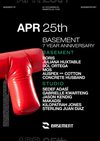 BASEMENT 7 Year Anniversary takes place at BASEMENT in New York City on April 25, 2026. Featuring Boris, Juliana Huxtable, Sol Ortega, Mos (NYC) and 9 more.