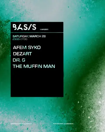 BASIS/ Afem Syko/ Dezart/ Dr. G/ The Muffin Man takes place at BASIS in Utrecht, Netherlands on March 28, 2026. Featuring Afem Syko, Dezart, Dr. G, The Muffin Man. Techno, House.