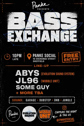 Bass Exchange takes place at Panke Social in Sheffield, United Kingdom on April 17, 2026. Featuring SOMEGUY. Bass and Garage sounds all night.