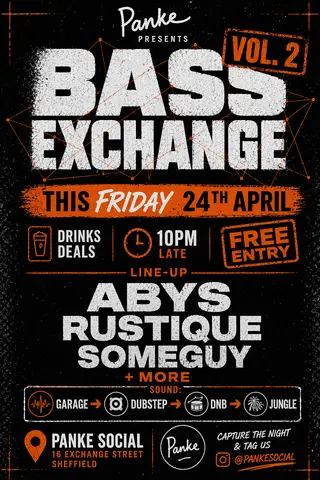 BassExchange takes place at Panke Social in Sheffield, United Kingdom on April 24, 2026. Featuring Garage, Jungle (UK), SOMEGUY, More (3). Drum & Bass and Garage sounds all night.