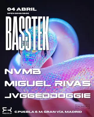 BASSTEK CLUB ONLY IN RA takes place at Republik Club in Madrid, Spain, on April 4, 2026. This event features artists NVMB, known for their contributions to the techno genre, and Miguel Rivas, who has a strong presence in the trance scene. Both artists are recognized for their distinct styles within their respective genres, contributing to the evening's focus on trance and techno music.