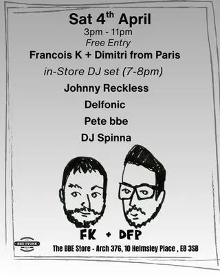 BBE instore feat Francois K and Dimitri From Paris, Delfonic, Dj Spinna takes place at The BBE Store in London, United Kingdom on April 4, 2026. Featuring Dimitri From Paris, Delfonic, DJ Spinna, Francois K. House sounds all night.