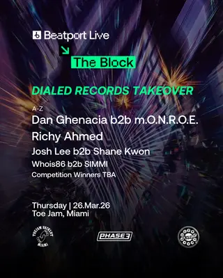Beatport Live - Dialed Records Takeover takes place at Toejam Backlot in Miami, United States on March 26, 2026. Featuring Dan Ghenacia, m.O.N.R.O.E., Richy Ahmed. Tech House, Minimal.