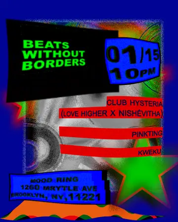 Beats without Borders starts 2026 with a bang bringing the sounds of Africa, the Caribbean, South Asia, the Midwest, and the East Coast under one roof for a night of global club sounds that will keep the speakers shaking and your feet moving. Love Higher and Nishévitha as Club Hysteria join pinkting and Beats without Borders resident Kweku at Mood Ring for a wide-ranging, heavy-hitting Thursday night affair guaranteed to warm up your winter night. Presented by @beatswithoutborders/@kweku.nyc DJs @club_hysteria (@love__higher & @paradoxicalpurpose) @dj.pinkting @kweku.nyc Poster by @itsmayitaaaa