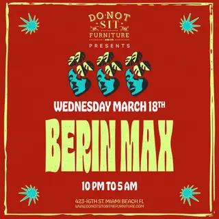 Berin Max takes place at Do Not Sit On The Furniture in Miami, United States on March 18, 2026. Featuring Maxi Degrassi, GEORGIA MAFIA. House and Deep House sounds all night.