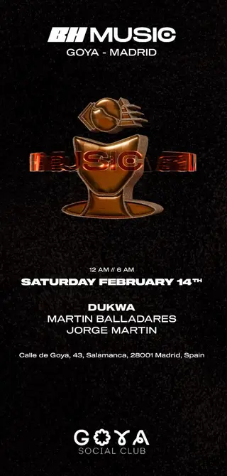 BH Music w/Dukwa takes place at Goya Social Club in Miami, United States on February 14, 2026. Featuring Dukwa, Martin Balladares. House and Tech House sounds all night.