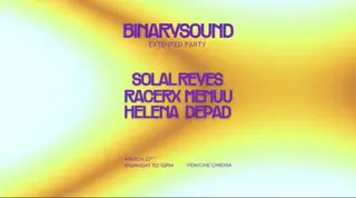 BinarySound with Solal Reyes, Menuu, RacerX, Helena & Depad on March 27, 2026 at La Péniche Cinéma, Barcelona features Solal Reyes, Menuu and Depad performing house DJ sets.