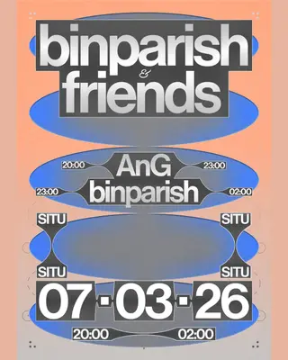 binparish & friends takes place at TBA - SITU in Eindhoven, Netherlands on March 7, 2026. Featuring AnG (NL). House and Ghetto Tech sounds all night.