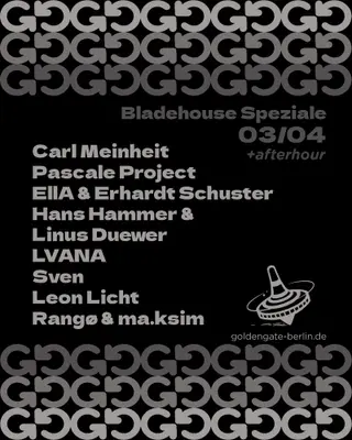 Bladehouse Speziale + Aftrehour takes place at Golden Gate in Berlin, Germany on April 3, 2026. Featuring Pascale Project, EllA, Erhardt Schuster, Hans Hammer and 2 more.