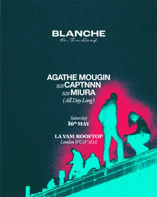 Blanche on the Roof with Miura B2B Agathe Mougin B2B Captnnn [All Day Long] on May 16, 2026 at LA-YAM Rooftop, London features Miura, Agathe Mougin and CAPTNNN' performing house DJ sets.