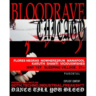 BLOODRAVE takes place at Sleeping Village in Chicago, United States on May 1, 2026. Featuring Flores Negras, MANAPOOL, KARUTH, Shanti. Techno and EBM sounds all night.