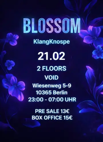 Blossom - KlangKnospe takes place at Void Club in Berlin, Germany on Saturday, February 21, 2026. Featuring DOCTOR MÜCKE, EGE363, EZA (DE), subga and 8 more. Trance, Techno.