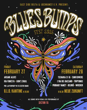 East Side Delta and Lockkunst e.V. proudly present the BLUES BUMPS Fest. 2 days of live music & sweat: 10 bands, DJs and visual light performances. FRIDAY, 27th February 2026, at B.L.O. Kantine With: Arcane Allies, Ira Funesta, Lion’s Skull, pre & afterparty with DJ Sister Snake >> doors 20:00, start 21:00 SATURDAY, 28th February 2026, at Neue Zukunft With: Tschaika 21/16, Sunflowers, L’Ira Del Baccano, Triptonus, Probably Nancy, Deliriô, Whisker >> doors 18:30, start 19:30 All shows with visual live performance by SECTOR 7G Presale on TixforGigs