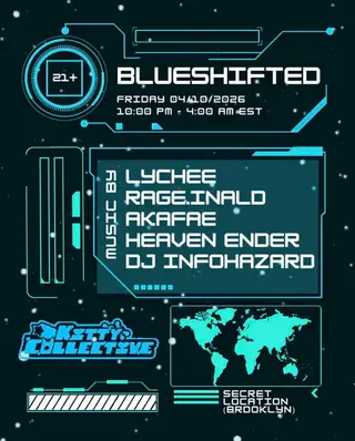 Blueshifted takes place at TBA - Secret Location Brooklyn in New York, United States on April 10, 2026. Featuring Lychee, DJ Infohazard. Trance and Techno sounds all night.