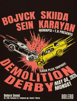 Bolero: Nomapsi x T.K presents 'Demolition Derby' on May 4, 2026 at Bolero, Seoul features bojvck, SKiiDA and KARAYAN performing club DJ sets.