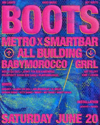 BOOTS PRIDE ALL-BUILDING Metro AND SMARTBAR WITH BABYMOROCCO, GRRL, AND MORE takes place at Metro in Chicago, United States on June 20, 2026. Featuring Jenny Fox, karennoid, GRRL, Gay Felony and 2 more. Techno and Club sounds all night.