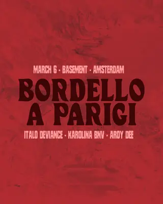 Bordello A Parigi takes place at Basement in Amsterdam, Netherlands on March 6, 2026. Featuring Italo Deviance, Marcello Giordani, Karolina Bnv, Aroy Dee. Disco and Italo Disco sounds all night.