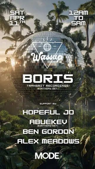 BORIS by Wassup takes place at MODE Downtown Miami in Miami, United States, on April 11, 2026. The event features DJ Boris, a prominent figure in the techno and tech house genres, known for his energetic performances and extensive work in the electronic music scene. The lineup reflects a focus on techno and tech house, showcasing DJ Boris's established style and expertise within these genres.
