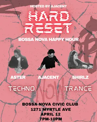 Bossa Nova Happy Hour: HARD RESET takes place at Bossa Nova Civic Club in New York City, United States on April 12, 2026. Featuring AJACENT, shirlz, ASTER (DJ). Trance and Techno sounds all night.