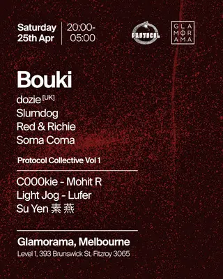 Bouki + Protocol Collective at Glamorama Saturdays takes place at Glamorama in Melbourne, Australia on April 25, 2026. Featuring Bouki, dozie (uk), Slumdog. House and Electronica sounds all night.