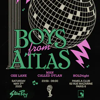 BOYS FROM ATLAS takes place at Pamela Club in Paris, France on May 2, 2026. Featuring Gee Lane, HOLDTight, Man Called Dylan. Deep House and Balearic sounds all night.