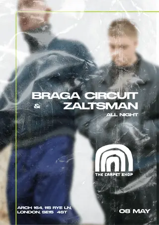 Braga Circuit & Zaltsman (All Night Long) takes place at The Carpet Shop in London, United Kingdom on May 8, 2026. Featuring Braga Circuit, Zaltsman. House sounds all night.
