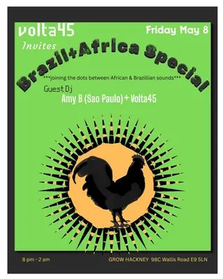BRAZIL AFRICA SPECIAL: DJ AMY B // VOLTA45 (SAMBA FUNK, AFRO-DISCO, HIGHLIFE, PROTO-HOUSE) takes place at Grow in London, United Kingdom on May 8, 2026. Afrobeat and Disco sounds all night.