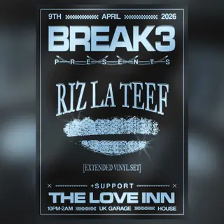 Break3 w/ Riz La Teef [extended set] takes place at The Love Inn in Bristol, United Kingdom on April 9, 2026. Featuring RIZ LA TEEF. House and Garage sounds all night.