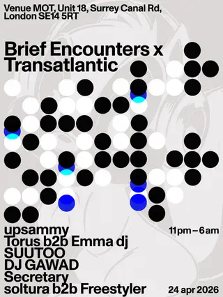 Brief Encounters x Transatlantic takes place at M.O.T in London, United Kingdom on April 24, 2026. Featuring upsammy, Torus, Emma DJ, Suutoo and 3 more. Experimental and Club sounds all night.