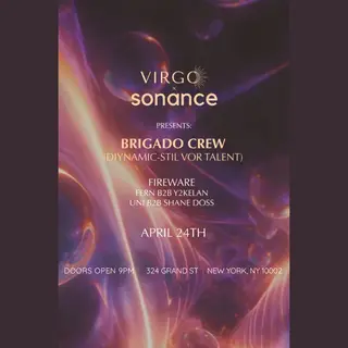 Brigado Crew at Virgo 04/24 takes place at Virgo in New York City, United States on April 24, 2026. Featuring VIRGO (2), Brigado Crew, fern (4), Uni (3). House sounds all night.