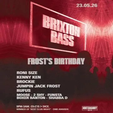 Brixton Bass - Frost's Birthday: Roni Size, Kenny Ken + Brockie takes place at Hootananny Brixton in London, United Kingdom on Saturday, May 23, 2026. Featuring Roni Size, Kenny Ken, Rufus (UK), Moose and 1 more. Drum & Bass, Jungle.