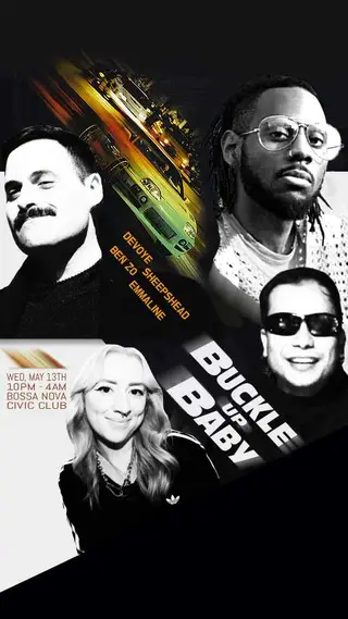 BUCKLE UP BABY takes place at Bossa Nova Civic Club in New York City, United States on May 13, 2026. Featuring Devoye, Sheepshead, Ben Zo, EMMALINE. Electronic sounds all night.