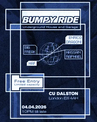Bumpy Ride takes place at Cu in London, United Kingdom on April 4, 2026. Featuring Ordinaire Records, Hassan Raphael. House and Garage sounds all night.