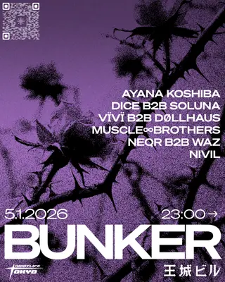 BUNKER HARD TECHNO FIRST EDITION on May 1, 2026 at Ohjo Bldg, Tokyo features AYANA KOSHIBA, DICE, Soluna, VÏVÏ, DØLLHAUS, MUSCLE ∞ BROTHERS, waz (1) and NIVIL performing techno DJ sets.