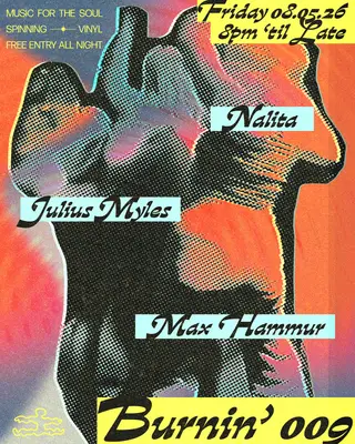 BURNIN' 009 with Nalita, Max Hammur, & Julius Myles takes place at Workshop in Melbourne, Australia on May 8, 2026. Featuring Max Hammur, Julius Myles. Deep House and Funk / Soul sounds all night.