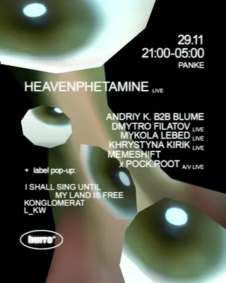 BURRE: NIGHT OF MANY on November 29, 2025 at Panke, Berlin features Andriy K., BLUME, Dmytro Filatov, Khrystyna Kirik, Memeshift, pock.root and Mykola Lebed performing DJ sets.