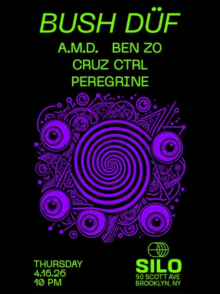 BUSH DÜF (Full Venue Event, Free with RSVP) takes place at SILO in New York City, United States on April 16, 2026. Featuring A.M.D., Ben Zo, cruz ctrl, Peregrine (US). Techno and Tech House sounds all night.