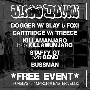 Buss Down takes place at Eastern Bloc Records in Manchester, United Kingdom on Thursday, March 19, 2026. Featuring dogger, Slay (1), foxi, Cartridge (UK) and 1 more. Drum & Bass, Dubstep.