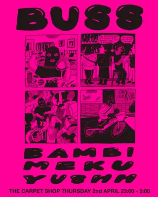 Buss with Bambi, Yushh & Meku on April 2, 2026 at The Carpet Shop, London features Yushh and Bambi (FR) performing bass DJ sets.