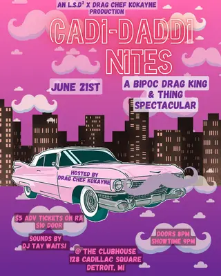 Caddi-Daddi Nites takes place at The Clubhouse Detroit on June 21, 2026. The event features Drag Chef Kokayne, known for blending pop and R&B influences in their performances. This event showcases the intersection of these genres within the Detroit music scene.