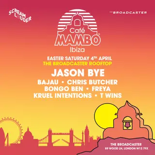 Cafe Mambo Ibiza London Rooftop Party on April 4, 2026 at The Broadcaster, London features Jason Bye and Bongo Ben performing house DJ sets.