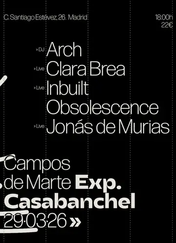 Campos de Marte Exp. Arch, Clara Brea, Inbuilt Obsolescence, Jonás de Murias takes place at Casabanchel in Miami, United States on Sunday, March 29, 2026. Featuring Clara Brea. Experimental, Electronica.
