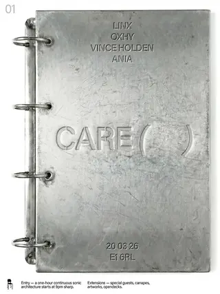 CARE ( ) — 01: Soundscapes, Live, Rituals and a Gallery Night takes place at TBA - Galleria Objets in London, United Kingdom on March 20, 2026. Featuring Oxhy. Club and IDM sounds all night.