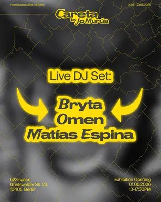 'Careta' a solo exhibition by Jo Murua + Live DJ Sets by Bryta, Omen and Matías Espina on May 1, 2026 at B23 Space, Berlin features Bryta, Omen and Mati Espina performing techno DJ sets.